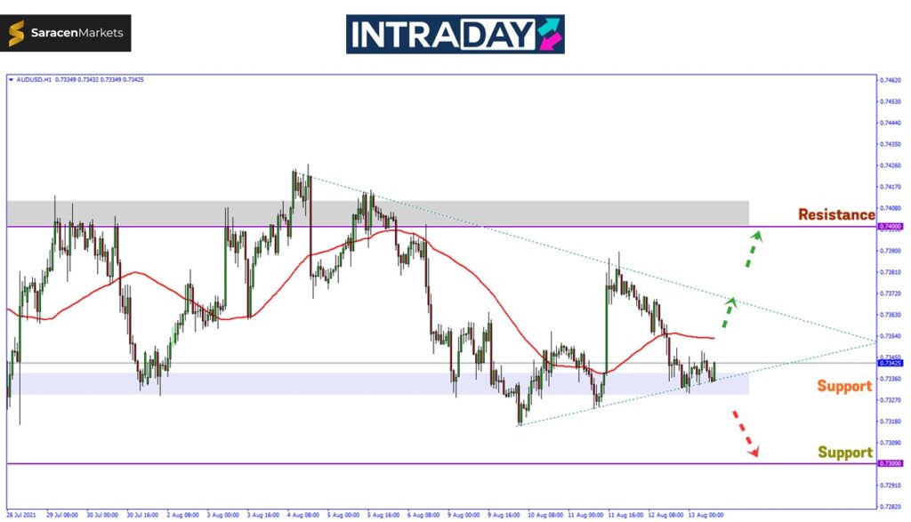 Setelah susut semula di bawah paras halangan Moving Average 50 (MA50) pada rangka masa 1 jam untuk isyarat pergerakan bearish, harga dilihat kembali semula berlegar di sekitar zon support 0.73300 sehingga bersambung pada dagangan Jumaat.