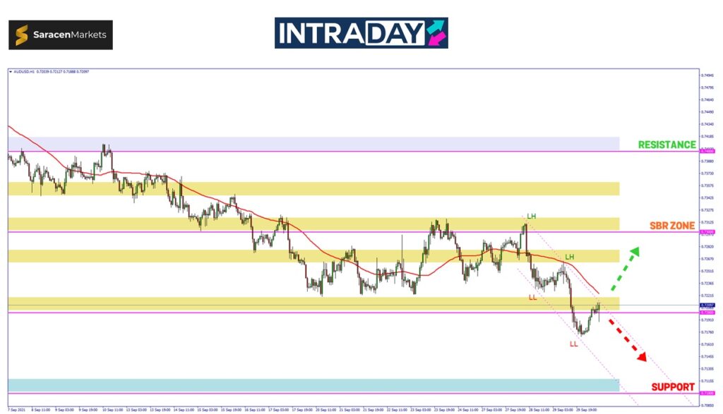 Zon SBR (support become resistance) 0.72000 berkemungkinan akan diuji terlebih dahulu sebelum pergerakan harga memberi petanda untuk kembali mencanak dengan lebih agresif.