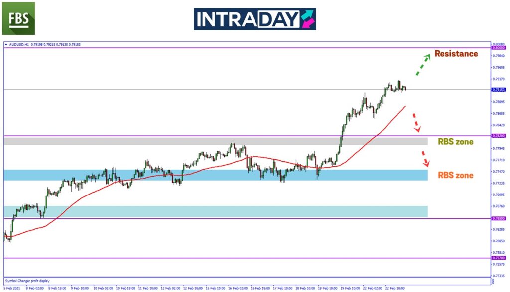 Pada carta harga pasangan mata wang AUD/USD, harga telah mencatatkan paras tertinggi terbaru sejak Februari 2018 lalu selepas harga telah melepasi paras 0.79000.