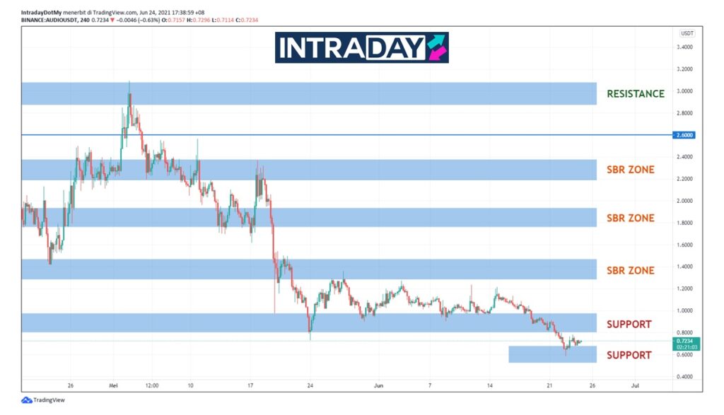 Meneliti kepada carta AUDIO/USDT, pergerakan harga AUDIO terus mengekalkan trend penurunan bermula pada pembukaan pasaran Mei untuk harga diperdagangkan di paras sokongan terendah sekitar $0.60.