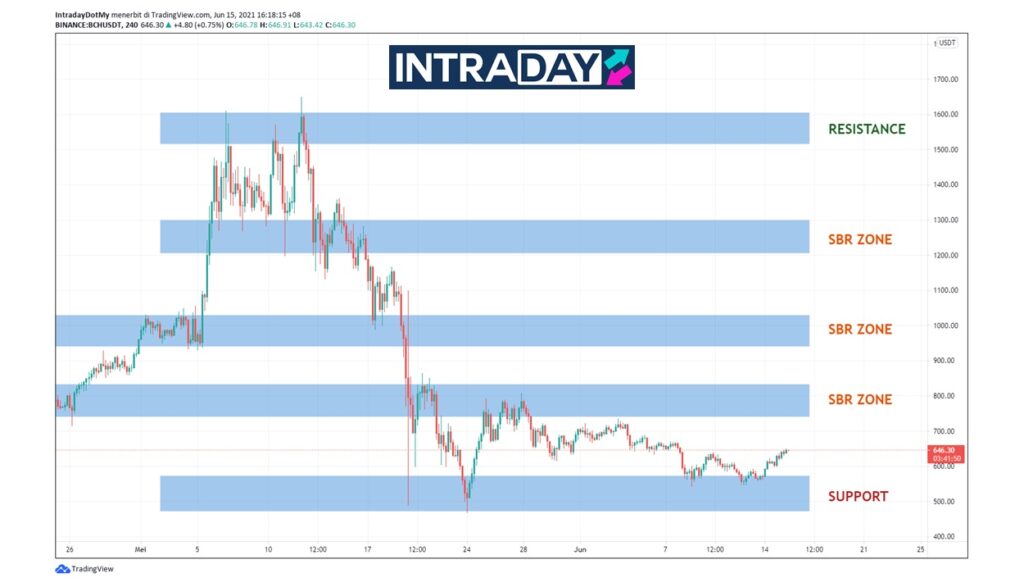 Namun di paras sokongan $500 tersebut, harga BCH membuat sedikit lonjakan untuk menguji paras SBR (support become resistance) sekitar $800 sebelum kembali menguji paras sokongan $500 semula.