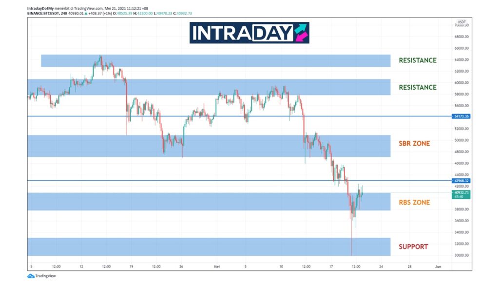 Namun jika corak penurunan terus dikekalkan, zon RBS $40,000 – $38,000 bakal diuji semula dan akan menguatkan lagi jangkaan untuk harga meneruskan penurunan dan mengekalkan trend bearish.