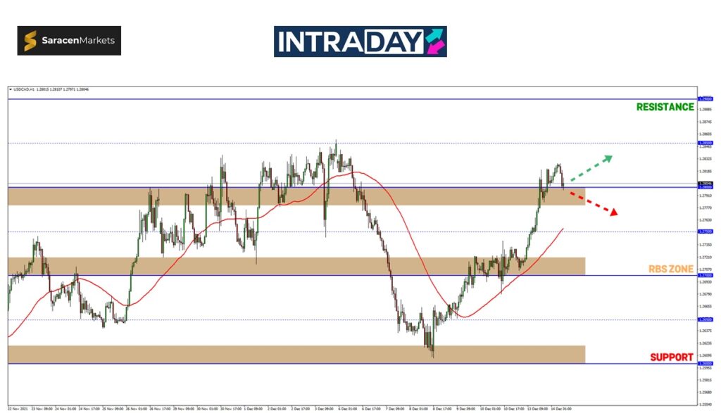 Pergerakan harga pada carta pasangan matawang USD/CAD nampaknya terus menampilkan lonjakan lebih 100 pips di sesi dagangan Isnin sehingga merobek zon RBS (resistance become support) 1.28000.