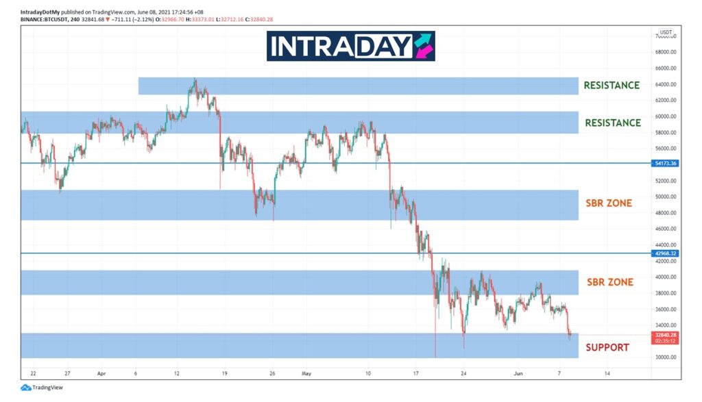 Penurunan tersebut kekal menjadikan zon SBR $40,000 sebagai paras rintangan penting yang perlu harga tembusi sebelum kembali memberi isyarat perubahan trend yang jelas bahawa trend kenaikan akan kembali rancak semula.