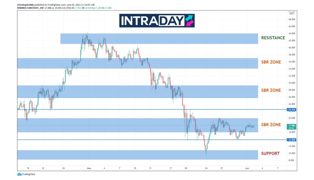 Jika diteliti pada carta pergerakan harga CAKE/USDT, harga CAKE kelihatan masih berlegar-legar dan bergerak perlahan di dalam zon SBR (support become resistance) di sekitar harga $18 setelah melonjak daripada paras sokongan $10 pada 24 Mei lalu.