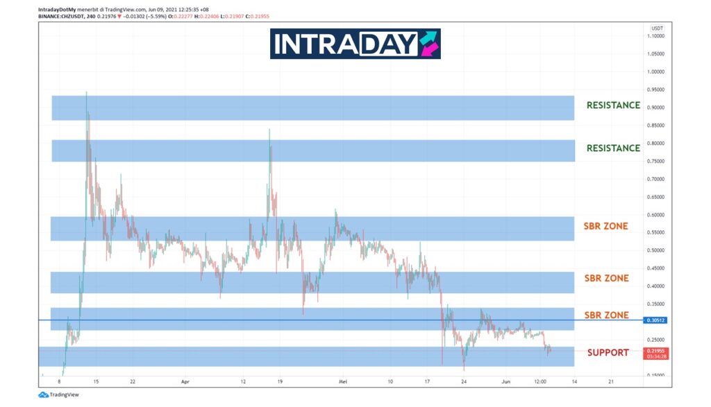 Sekiranya pergerakan harga CHZ berjaya menembusi paras rintangan $0.27-$0.33 tersebut, tumpuan seterusnya adalah menuju zon SBR (support become resistance) sekitar $0.40 sebelum membuat kenaikan ke paras yang lebih tinggi.