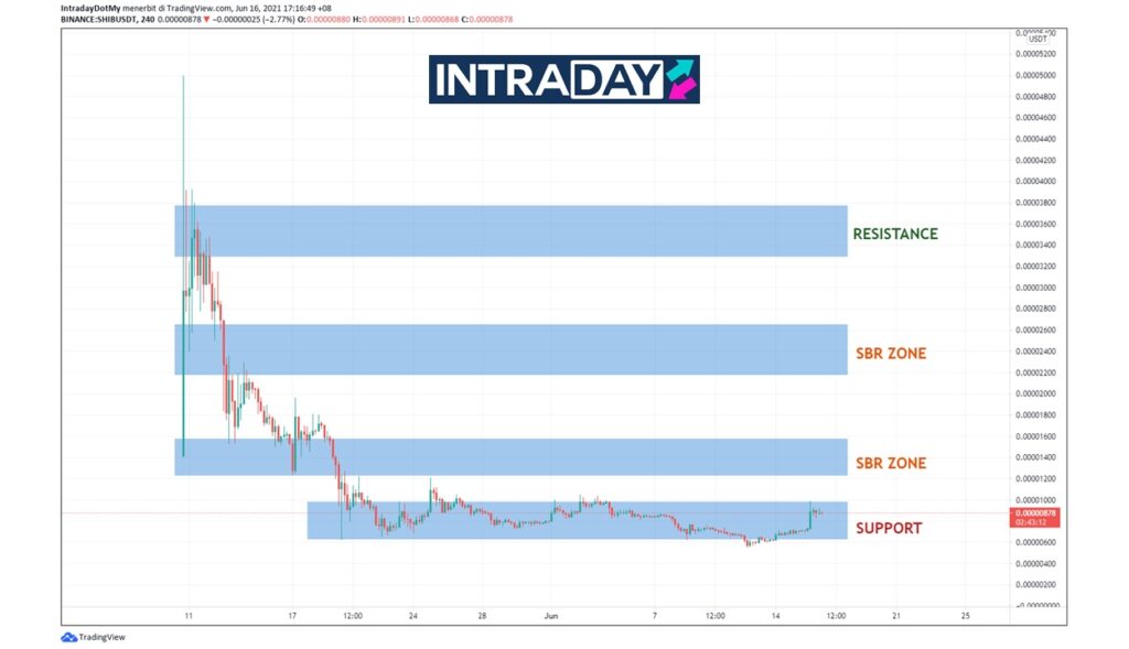 Akan tetapi, jika pergerakan harga terus menunjukkan corak penurunan dan menembusi paras sokongan sekitar $0.000006, pergerakan harga dijangka bakal kembali meneruskan penurunan sehingga mencatatkan paras terendah sepanjang masa (ATL) terbaru.