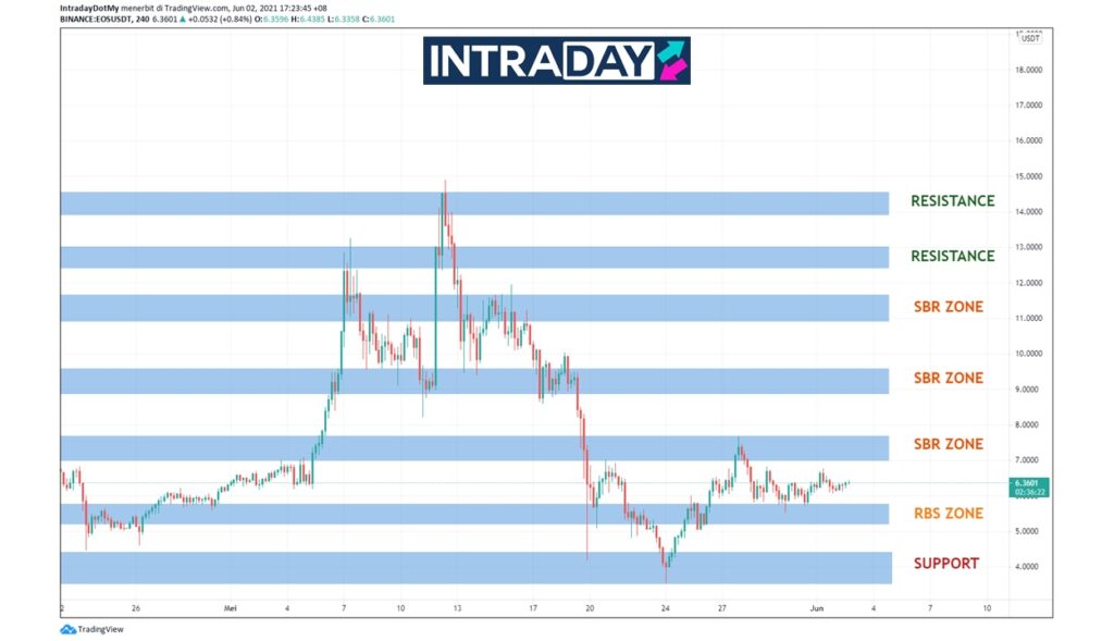 Seterusnya, meneliti pada carta pergerakan harga EOS/USDT, harga EOS kelihatan sedang berusaha untuk menembusi zon SBR (support become resistance) sekitar $7.0-7.6.