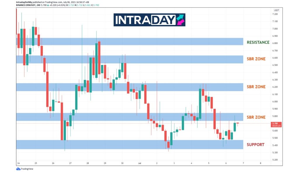 Bagi pandangan sudut teknikal, pergerakan harga ERN dilihat sedang berlegar-legar untuk berusaha mencapai kembali zon SBR (support become resistance) sekitar $5.80 dimana zon tersebut telah diuji beberapa kali sebelum ini.