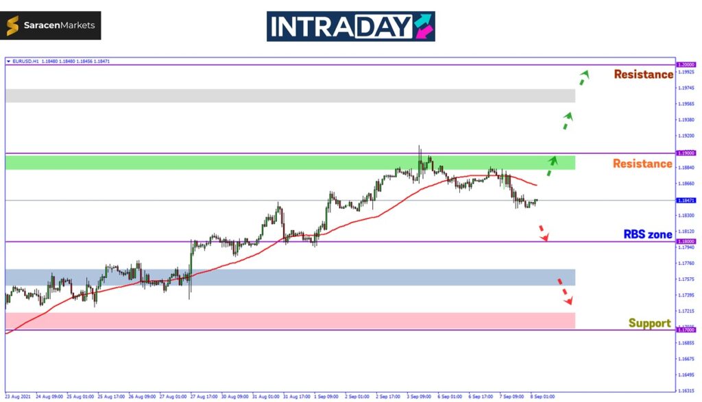 Dengan corak penurunan yang dipaparkan berkemungkinan akan mendorong harga untuk menuju ke paras sokongan 1.18000 bagi menguji zon RBS (resistance become support) tersebut.