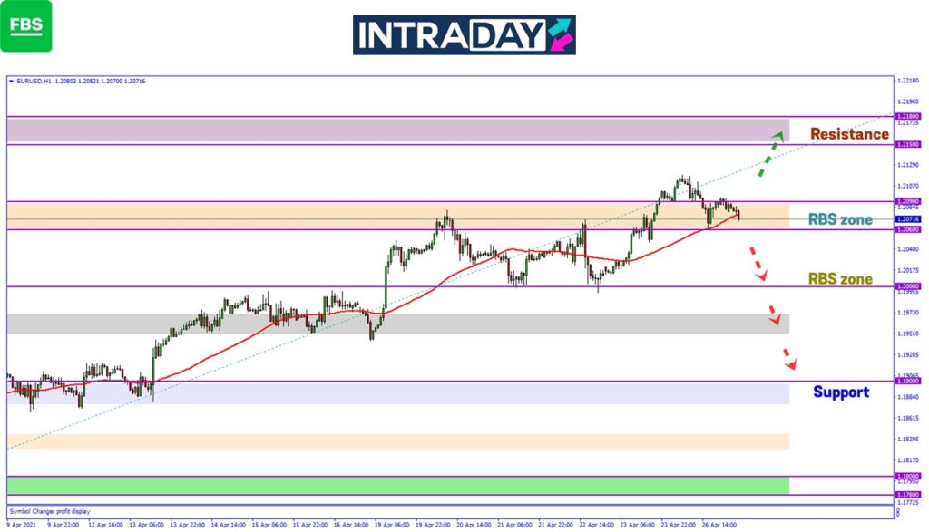 Sekiranya harga berjaya meneruskan kenaikan lebih tinggi dari zon tersebut, harga berkemungkinan akan mengatasi paras ketinggian harga semalam untuk menuju ke zon tumpuan seterusnya pada 1.21500-1.21800.