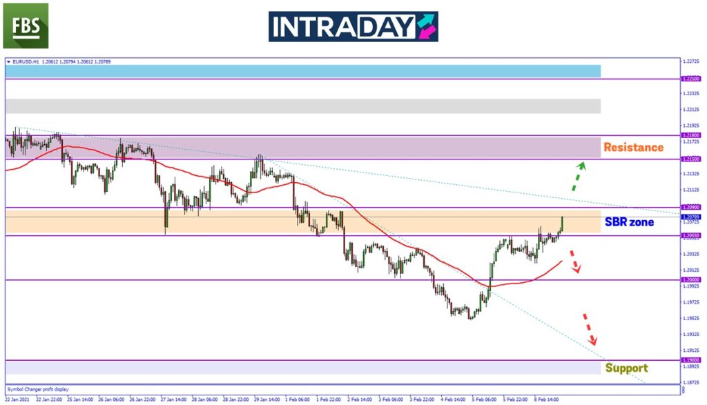 Trend bullish harga dinilai pada carta EUR/USD selepas harga bergerak di atas paras sokongan Moving Average 50 (MA50) pada rangka masa 1 jam dengan paras rintangan 1.20550 diuji pada awal minggu ini.