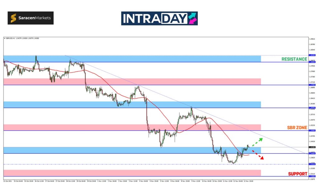 Andai kata pergerakan harga kekal bergaya dalam merekodkan lonjakan, trendline resistance sudah semestinya akan menjadi tumpuan utama sebelum jangkaan harga akan mencapai zon SBR 1.35000.