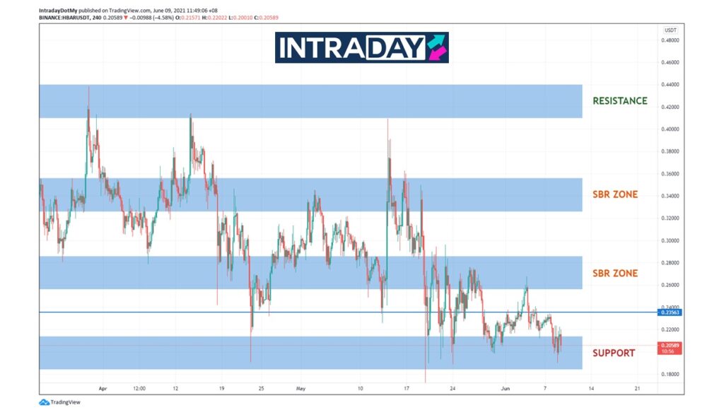 Dengan ketidaktentuan pasaran kripto pada pembukaan pasaran Jun, harga HBAR nampaknya hanya berlegar di paras harga sekitar $0.23 dan seterusnya kembali membuat penurunan untuk menguji paras sokongan sekitar $0.18-$0.21.
