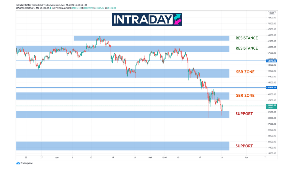 Dapat dilihat pada carta pergerakan harga BTC/USDT, penjualan yang dibuat terus mendorong harga BTC untuk susut lebih rendah kembali menguji paras sokongan yang dicatatkan pada tahun ini pada zon $30,000 sebelum menutup dagangan mingguan sekitar $35,000.