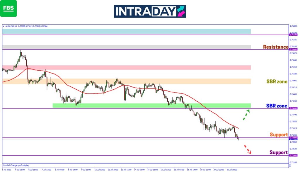 Pada carta pasangan mata wang AUD/USD, harga telah membuat penurunan ke paras terbaru pada minggu ini selepas melepasi zon support 0.74000.