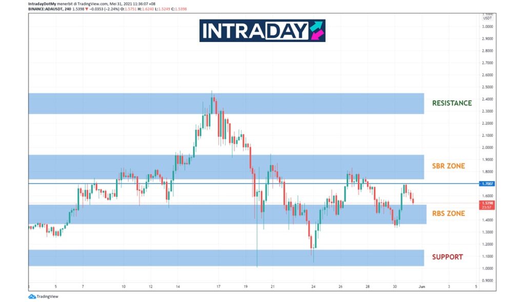 Pandangan sudut teknikal, trend kenaikan dapat dilihat pada pergerakan harga ADA yang telah menembusi zon RBS sekitar $1.36-$1.52 sebelum ini dan membuka dagangan hari ini di atas paras $1.60.