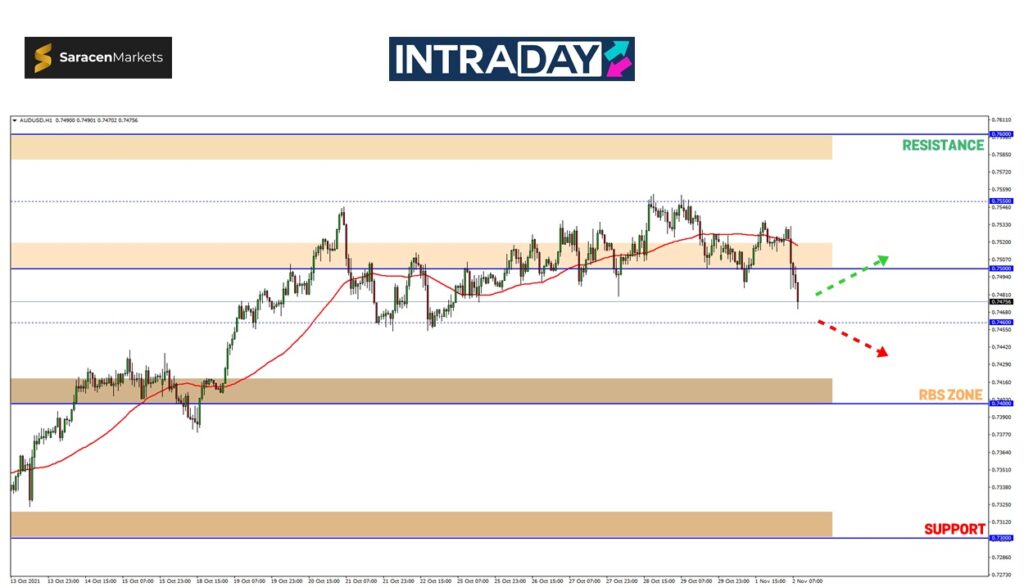 Andai kata pergerakan harga terus menjunam, paras sokongan sekitar 0.74600 dijangka akan diuji semula sebelum memberi petunjuk awal yang lebih jelas untuk membuat perubahan trend bearish.
