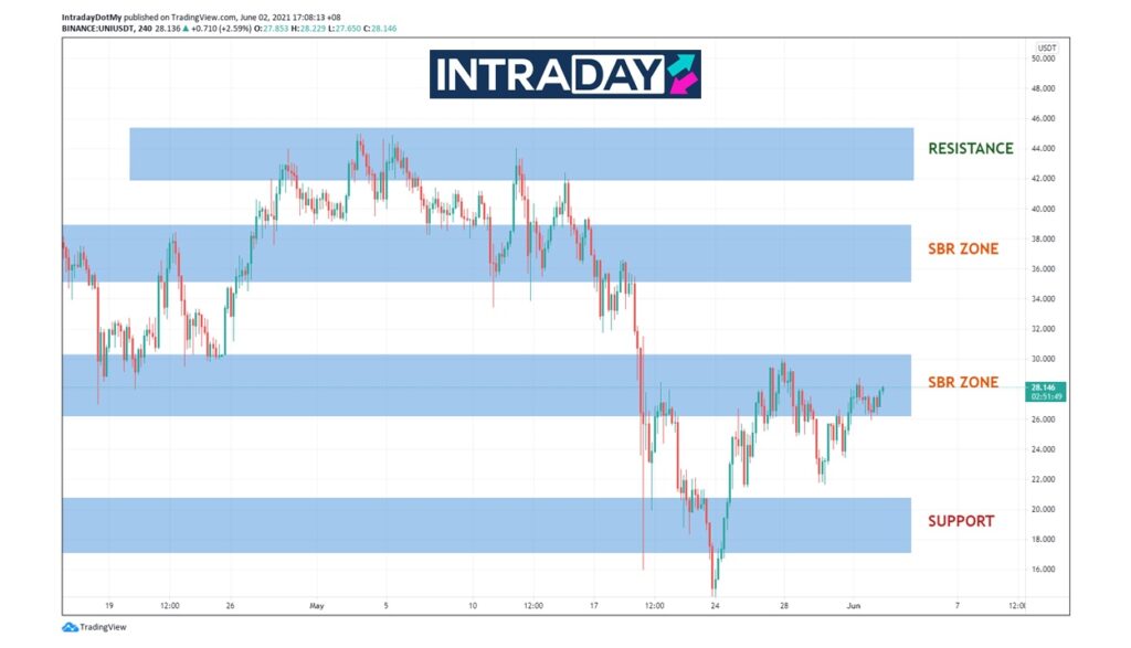 Lonjakan yang terjadi telah mendorong harga UNI untuk kembali menguji zon SBR (support become resistance) sekitar harga $27-$30 sebelum jangkaan untuk harga melonjak lebih tinggi.