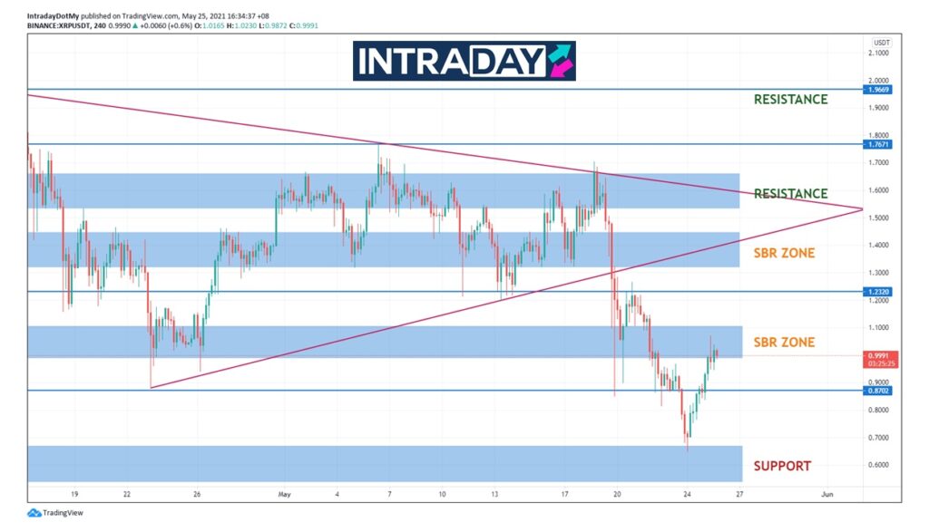 Melihat carta pergerakan harga XRP/USDT, harga sedang menguji paras SBR (support become resistance) sekitar $1.0 dan telah membuat kenaikan sehingga ke paras ketinggian $1.07 sebelum bergerak perlahan sekitar harga $1.0.