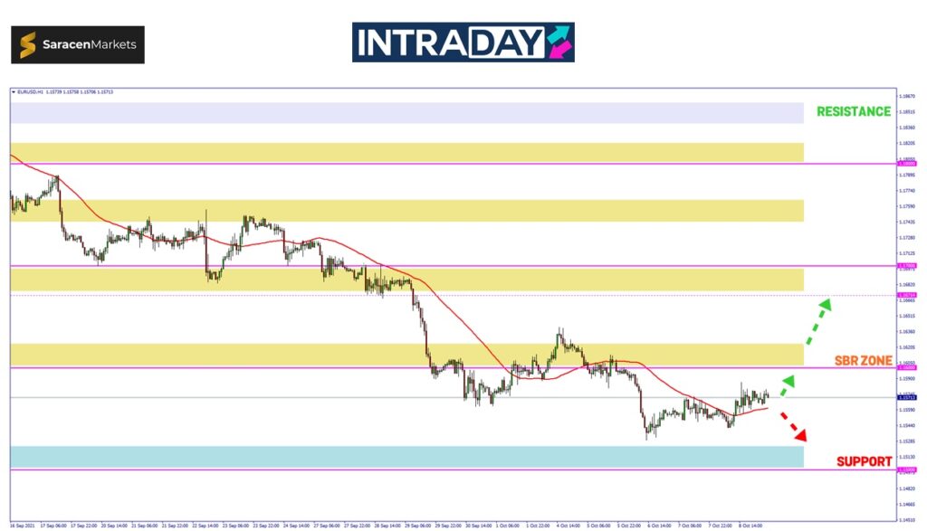 Sekiranya harga pada carta EUR/USD berjaya menembusi paras tumpuan 1.15700 yang dicapai pada sebelum ini, berkemungkinan akan kembali menguji zon SBR (support become resistance) 1.16000.