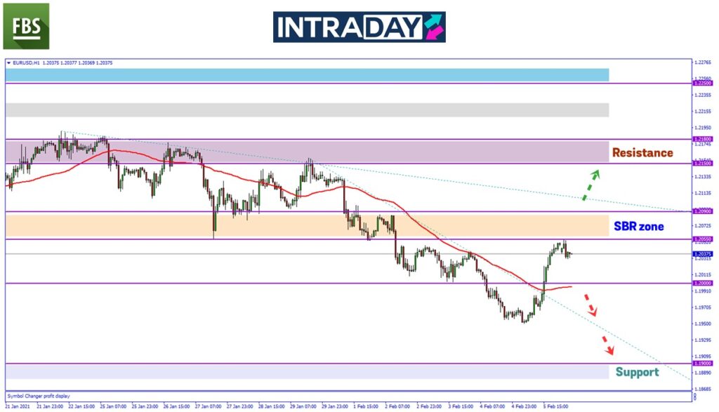 Melepasi rintangan pada paras 1.20000, harga meneruskan kenaikan pada penghujung dagangan sesi New York minggu lalu sehingga ke paras SBR (support become resistance) 1.20550.