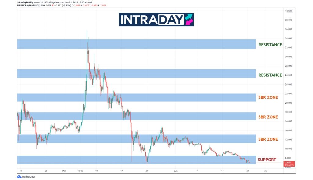 Bermula pasaran Jun, pergerakan harga QTUM menyaksikan pergerakan harga yang lemah selepas menguji zon SBR (support become resistance) sekitar $12, ia gagal meneruskan kenaikan sehingga kembali membuat penyusutan diparas sokongan sekitar $7.0.
