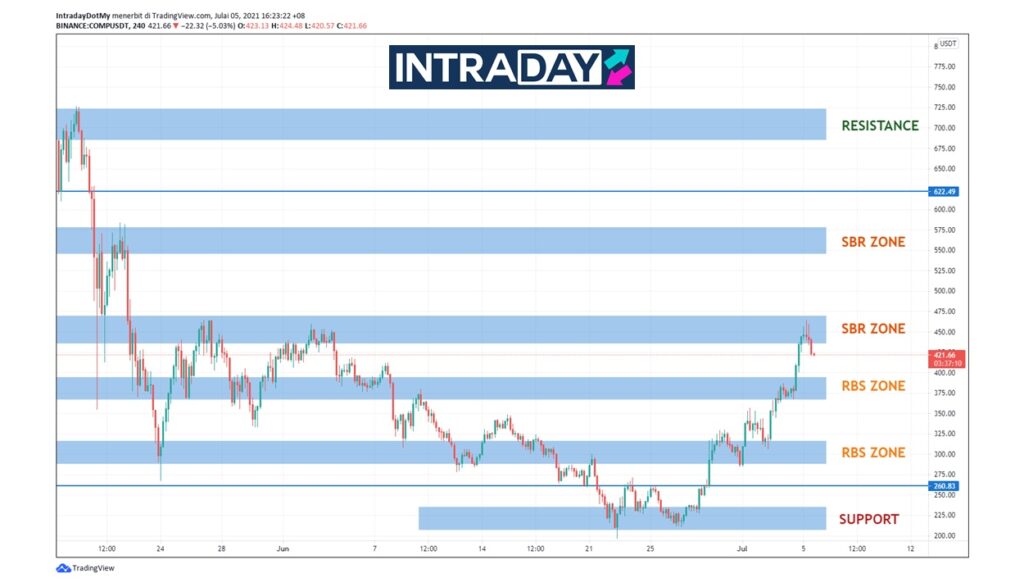 Jika pergerakan harga COMP terus mempamerkan trend kenaikan, harga dijangka bakal menuju ke paras SBR seterusnya pada $560 sebelum jangkaan untuk lonjakan lebih tinggi.