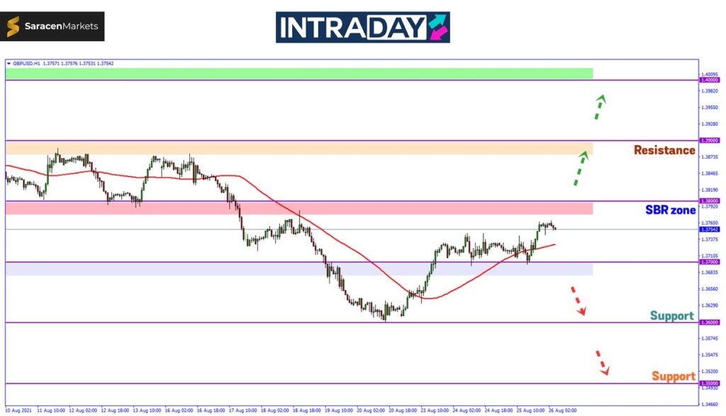 Dengan isyarat bullish harga yang masih bergerak di atas paras sokongan Moving Average 50 (MA50) pada rangka masa 1 jam dilihat akan meneruskan kenaikan menuju ke zon SBR (support become resistance) 1.38000.