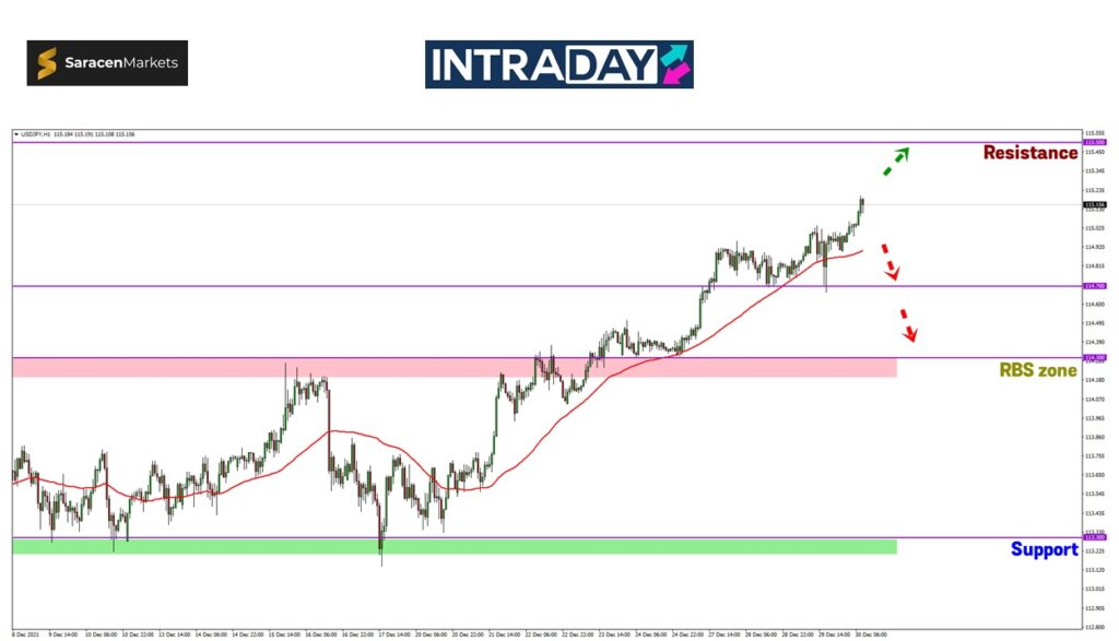 Penurunan lebih rendah dijangkakan akan ke zon RBS (resistance become support) pada 114.300 selepas kenaikan berjaya tembusi rintangan tersebut pada minggu lalu.