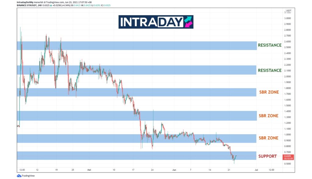 Setelah itu, STX gagal mengekalkan rentak kenaikan sehingga menyusut ke zon SBR (support become resistance) sekitar $0.90 pada penghujung bulan Mei.