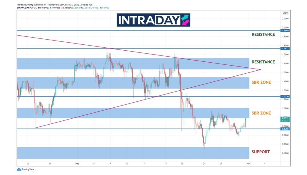 Jangkaan seterusnya, jika harga XRP berjaya kembali dengan momentum kenaikan, zon SBR (support become resistance) sekitar harga $1.0 bakal menjadi sasaran para pelabur untuk diuji semula dan seterusnya bakal memberi penanda aras untuk membuat kenaikan yang lebih drastik.