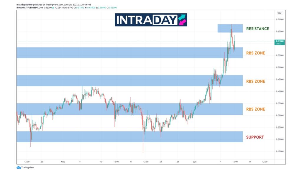 Dapat dilihat pada carta TFUEL/USDT, menjelang penghujung dagangan Mei, TFUEL sudah pun mula menunjukkan pergerakan yang positif setelah menembusi paras RBS (resistance become support) sekitar harga $0.30-$0.35.
