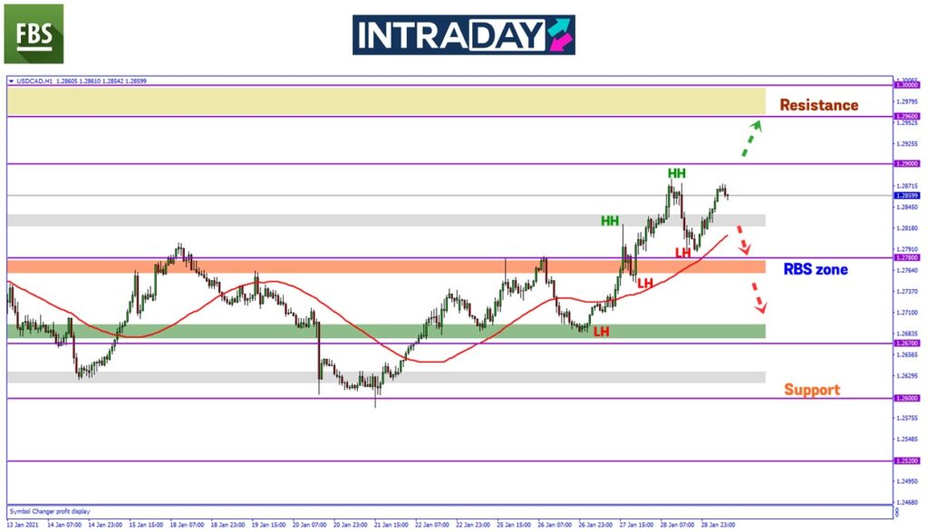 Namun jika US dolar kekal bergerak susut pada sesi berikutnya, harga boleh menjunam semula menguji zon RBS (resistance become support) pada 1.27800.