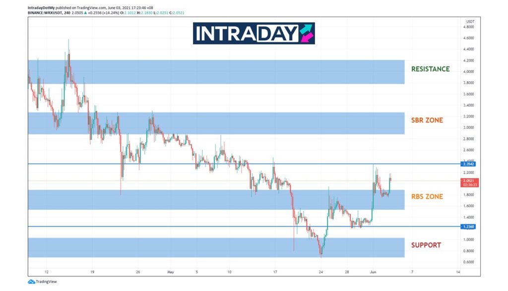 Dapat diperhatikan pada carta WRX/USDT, nampaknya harga WRX telah membuat kenaikan melebihi 50% pada pembukaan pasaran Jun sehingga menembusi paras RBS (resistance become support) sekitar harga $1.60-$1.80 untuk didagangkan di atas paras harga $2.0 pada pergerakan pasaran hari ini.