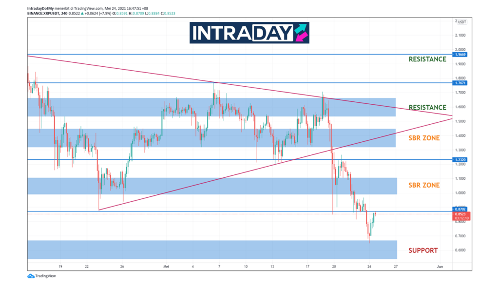 Namun jika harga berjaya mengekalkan momentum kenaikan, paras SBR (support become resistance) sekitar $1 bakal menjadi sasaran awal untuk dicapai dan seterusnya menyambung semula trend kenaikan harga.