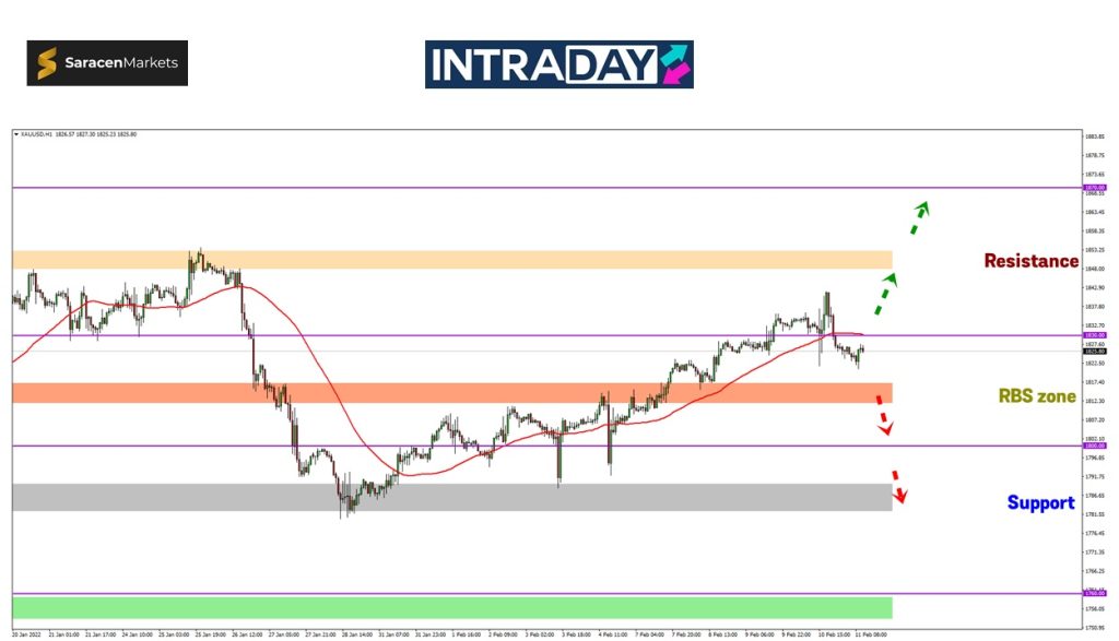 Dengan jangkaan pengukuhan US dolar yang akan memberikan tekanan terhadap dagangan emas, harga bakal meneruskan penurunan menuju zon RBS (resistance become support) 1815.00 sebelum ke paras tumpuan 1800.00.