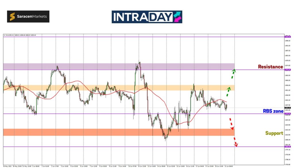 Pada carta harga XAU/USD yang mengukur nilai emas berbanding US dolar, harga pada Jumaat lalu dilihat membuat penurunan yang dijangkakan berlakunya aktiviti profit taking oleh para pelabur sebelum harga mendatar antara sekitar 1835.00 dan 1846.00 bersambung hingga dagangan awal minggu ini.