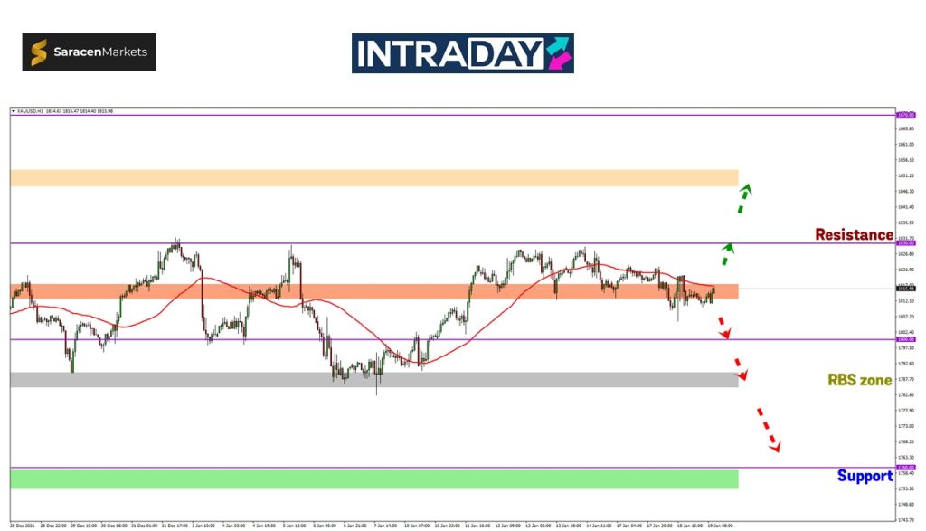 Harga telah bergerak mendatar di bawah paras halangan Moving Average 50 (MA50) pada rangka masa 1 jam, berlegar di sekitar zon 1815.00.