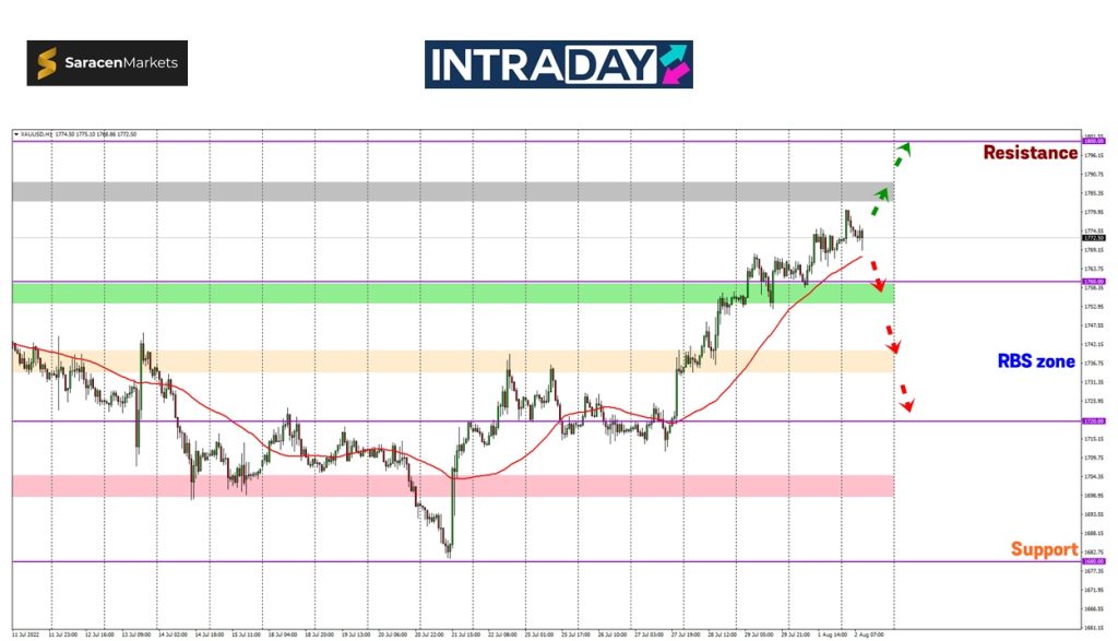 Jika harga berjaya menembusi paras halangan tersebut, harga dijangka untuk meneruskan kenaikan selanjutnya ke zon sasaran 1800.00 sekali gus mencatatkan paras ketinggian terbaru 4 minggu.