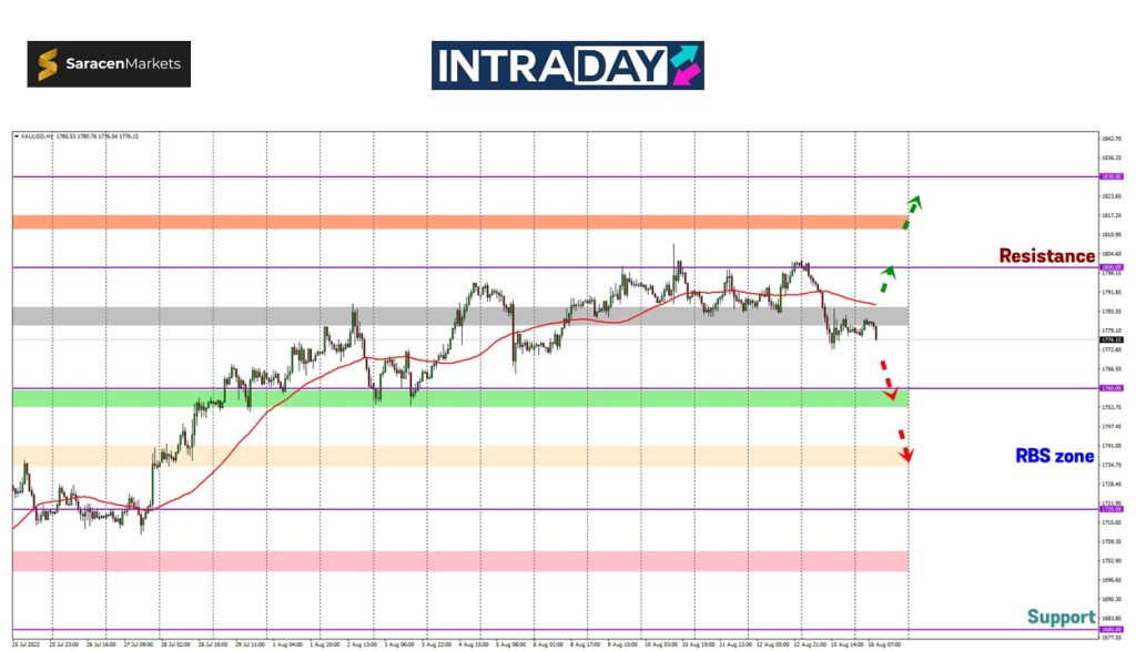 Sekiranya zon tersebut berjaya harga tembusi, kejatuhan yang lebih rendah bagi emas diramalkan bakal menyusut sehingga ke zon RBS (resistance become support) 1740.00 sebelum jangkaan seterusnya untuk mencecah paras 1720.00 yang menjadi tumpuan.
