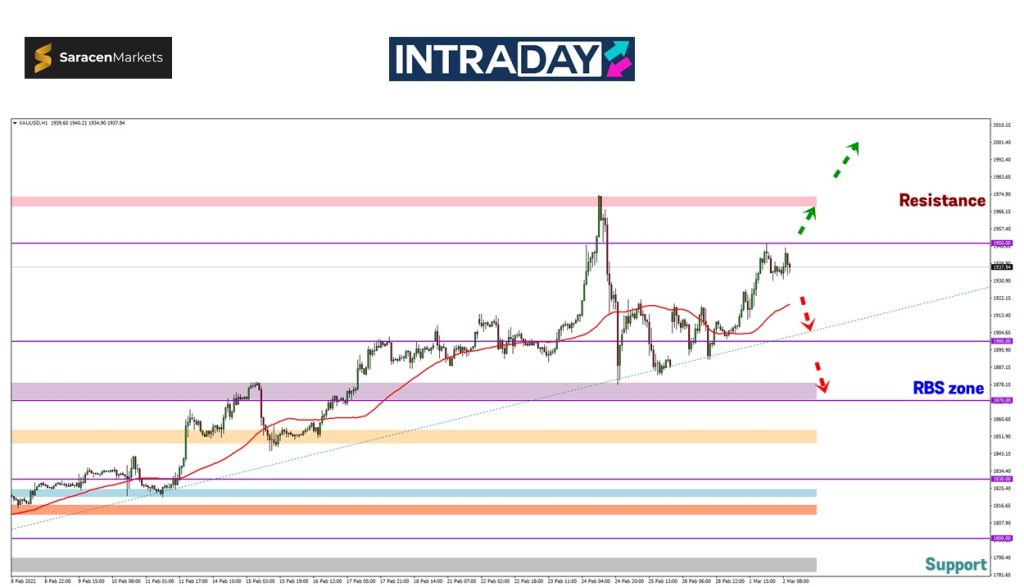 Penurunan lebih rendah yang diteruskan akan menuju zon RBS (resistance become support) pada 1870.00 untuk diuji sebelum harga memberi isyarat awal untuk perubahan trend bearish.