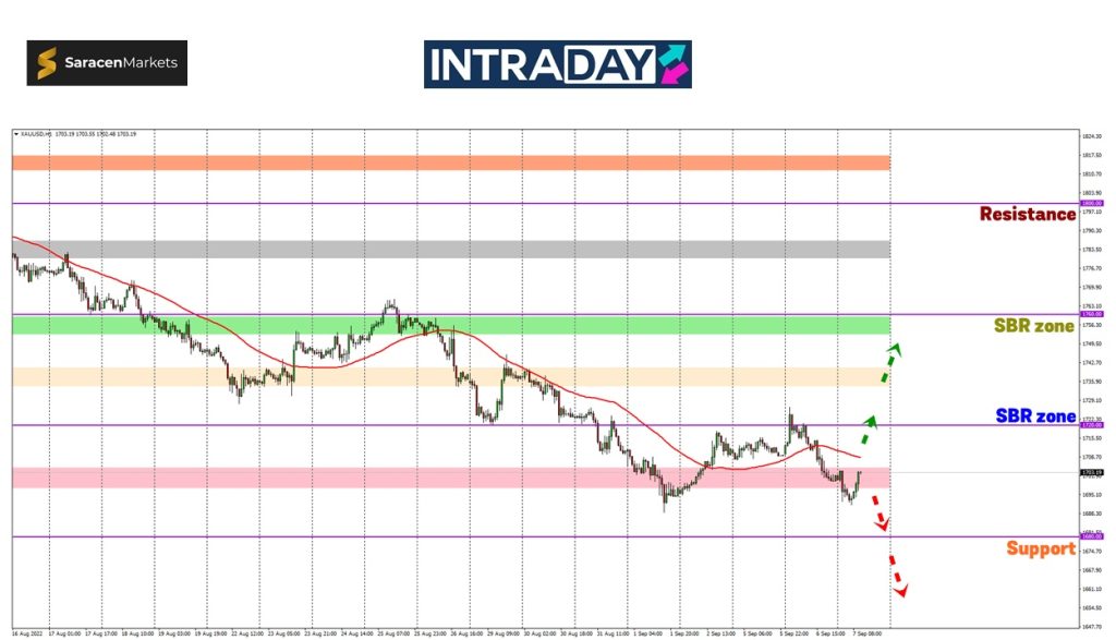 Mengukur nilai harga komoditi emas berbanding US dolar pada carta pasangan XAU/USD, harga telah menunjukan penerjunan harian sekitar 280 pips pada Selasa semalam selepas harga gagal untuk melepasi zon support become resistance (SBR) 1720.00 yang diuji pada dagangan awal sesi Asia semalam.