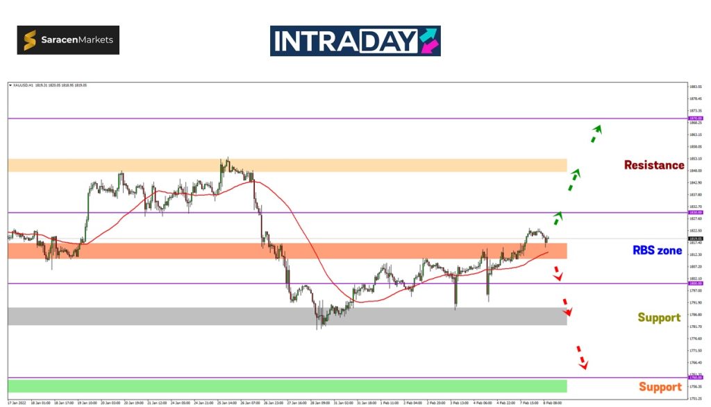 Berkemungkinan kenaikan harga yang diteruskan bakal menguji paras 1830.00 pada zon SBR (support become resistance) tersebut.