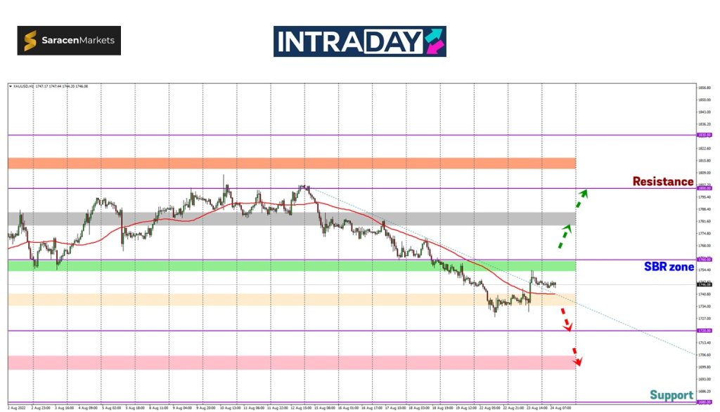 Jika kenaikan berjaya diteruskan, rintangan awal yang perlu ditembusi harga adalah pada zon SBR (support become resistance) 1760.00 terlebih dahulu sebelum pelabur lebih yakin untuk pergerakan emas yang lebih bullish.
