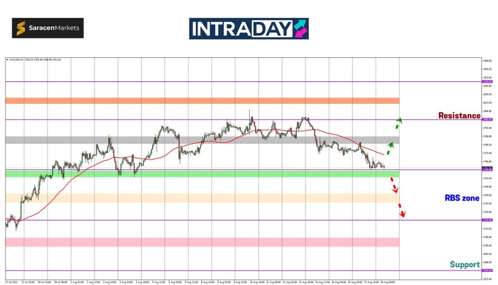 Sekiranya corak penurunan masih diteruskan, harga berkemungkinan akan melepasi zon sokongan 1760.00 susut lebih rendah menuju ke zon RBS (resistance become support) 1740.00 pula.
