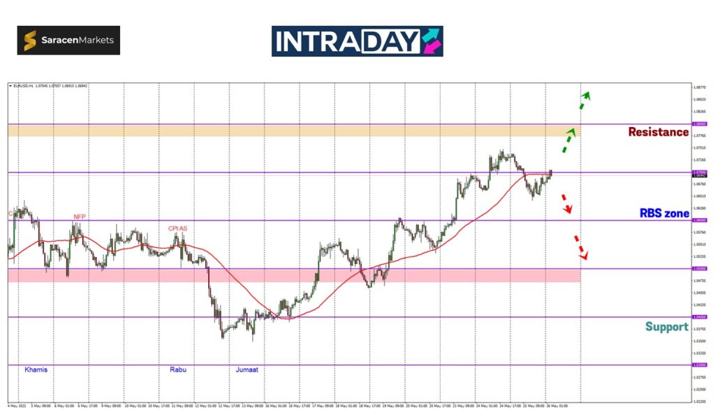 Jika penurunan harga bersambung hari ini, harga dilihat akan turun menuju ke paras 1.06000 untuk menguji zon RBS (resistance become support) tersebut.