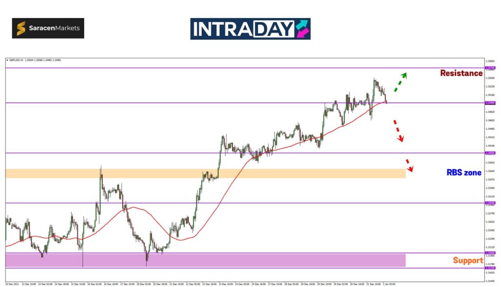 Untuk penurunan lebih rendah, zon tumpuan pada 1.34000 akan diuji sebelum zon RBS (resistance become support) 1.33600 pula akan memberi isyarat pergerakan harga selanjutnya.