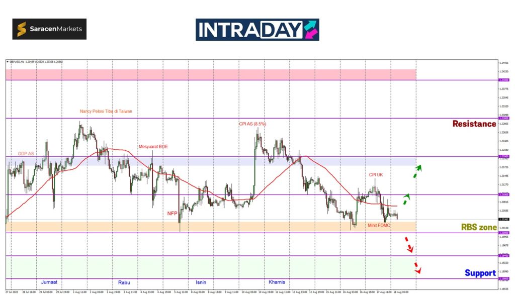 Jika diperhatikan, harga dilihat menunjukkan lonjakan pada Selasa lalu dari zon support 1.20000, namun selepas terbitan data inflasi UK pada Rabu semalam, harga kembali menyusut selepas mencapai paras ketinggian 1.21400 dengan penurunan harian sekitar 110 pips dicatatkan.