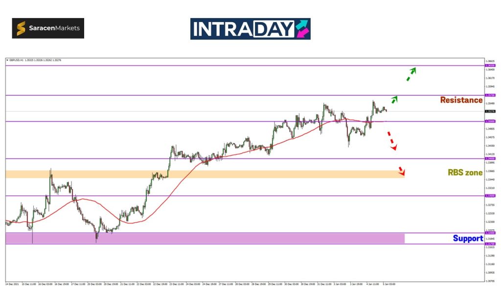 Penurunan harga dilihat akan menuju paras 1.34000 dan juga zon RBS (resistance become support) pada 1.33600.